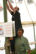 NFU on mine and Simon’s shoulders attaching posters and flags
