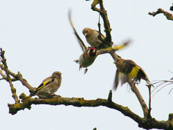 Attracted by the sudden burst of bird song I spotted this group of Goldfinch. The photograph shows an adult bird and three immature birds. Bye for now, Andy Back