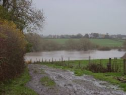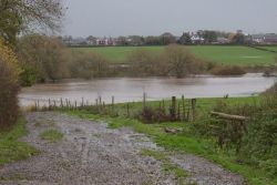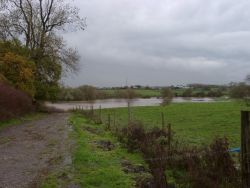 Paul took these pictures at about 10am and at this point the water was still rising. When he took the pictures the heifers were on high ground on the Middle Meadow, out of harms way or so I thought. At 2pm I got a gut feeling to go down again and check and found them stranded on a strip of grass at the riverside. Although they could have followed me around the edge in a mere 300mm (1ft) of water, they, having seen the gate open at the opposite side of the field (where I wanted them) they made for it. Now bearing in mind that the middle meadow slopes from the gateway upwards to the river when they reached the middle of the field they were forced to swim for it. Next-Door neighbour Chris from his back- yard watches all this. "Just like one of those western films" was the quote when I saw him 3 days later. If they get into that depth of water where they are now I'll be worried, the town of Middlewich will be under 7m (22ft) of water. The next series of photos was taken a mere 48 hours later
