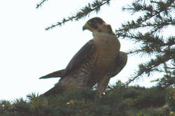 This Peregrine falcon (actually it is a cross bred bird from a Peregrine falcon and I think a Saker falcon) provided amusement when it decided that sitting in a tree watching strange bipedal creatures was easier than working for a living.