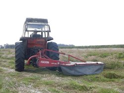 It cuts 1.75m at once. Also it has no conditioner fitted. However it is well suited to mowing small patches for hay.