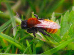 Although it looks at first glance like a honey bee, it is if fact a Tawny Mining Bee. They are solitary bees and nest in the soil.