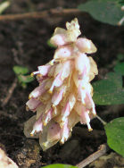 This is Toothwort also known as "corpse flower" it was given this name because it was belived that such a pale "ghostly" plant would only grow on a buried body. It has no green parts or leaves as it is a parasite and extracts its nutrients from the host plant, therefore it does not need chlorophyll that gives other plants their green colour.