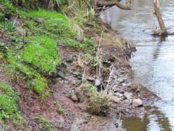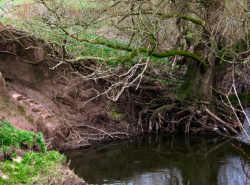 A little further downstream another area of erosion is steadily removing the soil from around the roots of this willow (left).