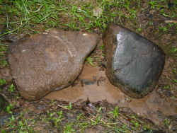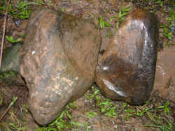 Some of the stones show quite distinct "tool" marks. They are confined to a relatively narrow band along the bank and there is no other natural outcrop of similar sized stones to be found ?