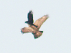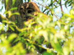 It was being given a very hard time by what may have been a rook. The buzzard will normally fly away from the harassing bird but I have seen one instance when the buzzard did a mid-air role and took out one of the aggressors which got too close. Somewhat closer, an almost silent movement directed my eyes towards the branches of a nearby tree.