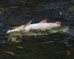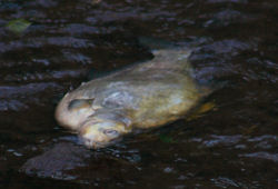 Again as our picture shows these are plentiful this year and after a little fermentation they're not too bad either Hic!!! A word or two of advice at this point. Don't go picking and eating every berry / fruit that you see. While many are harmless and quite tasty, there are just as many that can make you very poorly or even prove fatal. Take care what you pick. and always obtain expert advice. IF IN DOUBT - DON'T TOUCH. Talking of fatalities, I was informed by Phil that it looked as though there had been something that had polluted the river Dane and caused the deaths of hundreds of fish. By the time that I could get down to take some pictures, (the next day) most had been carried away by the current but as you can see from these photographs there were still a lot of dead fish to be seen.