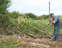 Why do this? I hear you ask. Well the function of a hedge is basically to help keep animals (cattle , sheep etc.) either in or out of an area of land. Unfortunately gaps always develop between the stems of the hedgerow plants and animals always find and push through them. By laying a hedge and bending the stems of the plant sideways the gaps can be closed. New growth further helps to re enforce the "layed" hedge and forms a very sturdy and effective barrier. A close inspection of old hedgerows often reveals signs of laying that have taken place many years ago and more than once. |