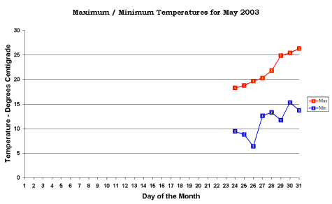 From this the following graph was produced. Although the month ended on a warm note, it had for the most part been quite a wet one with some 86mm of rain. This made it the wettest May since we started to keep our records.