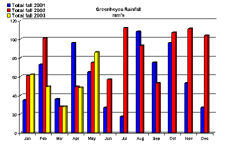 Welcome to our new section on the weather. As you will know, for the past couple of years we have been recording the monthly rainfall here at Greenheyes and Andy has been using the figures to produce a small graph for the monthly report.