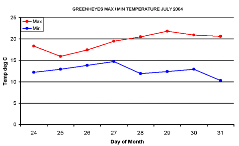 We have now managed to find a replacement for our broken temperature sensor and we can at last resume our study of this aspect of the weather. The graph below shows the temperature for the last week of July (we restarted on the 24th)