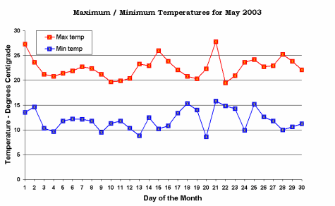 Welcome to our second weather page. This is the first complete month that we have temperature data for. As with last month the temperature recorded is the Maximum and Minimum for each day, this produces the following table.