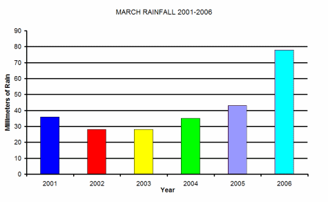 | Normally March is one of our driest months, however this year with 78mm we have had almost double the average since we started to take records in 2001