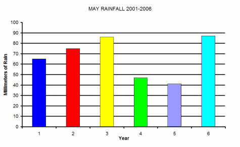 Our final graph shows the rainfall in May for the period from 2001 to 2006. Why not start your own weather station up either at school or home and compare your results to ours. we would be interested to see them. Regards Phil.